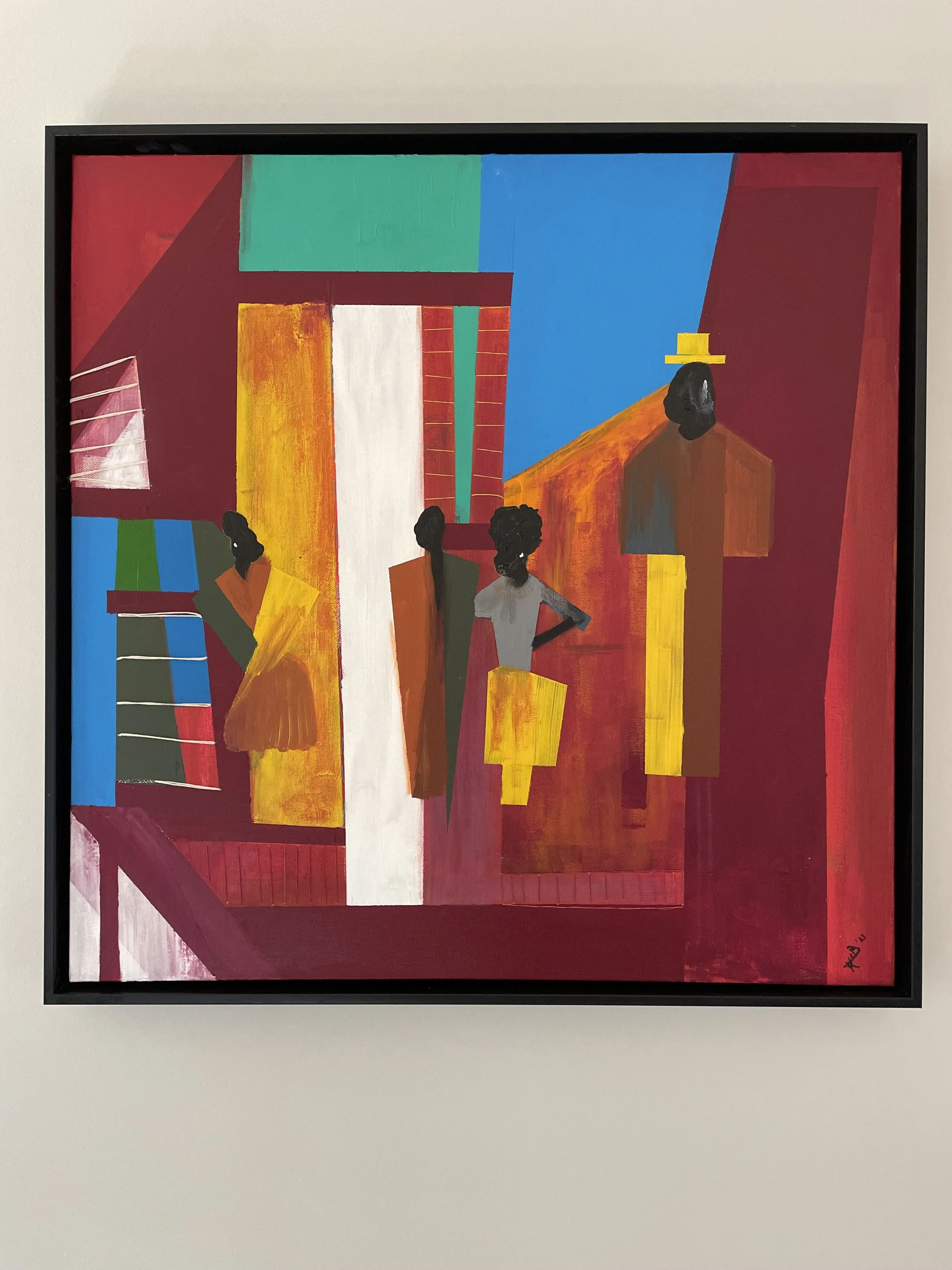 “2 Train” (24" x 24", framed mixed media on canvas) is a reflection on my relationship with my mother and the cultural forces that shaped her—and, in turn, shaped me. We grew up hearing stories of our grandfather, a studious yogi whose calm, commanding presence lingered beyond his life. We were raised by Granny Norma, a lifelong health and social services worker who instilled discipline, posture, and purpose. “2 Train” envisions the world through the eyes of my mother and uncle in their youth—reimagined through a modern abstract lens.