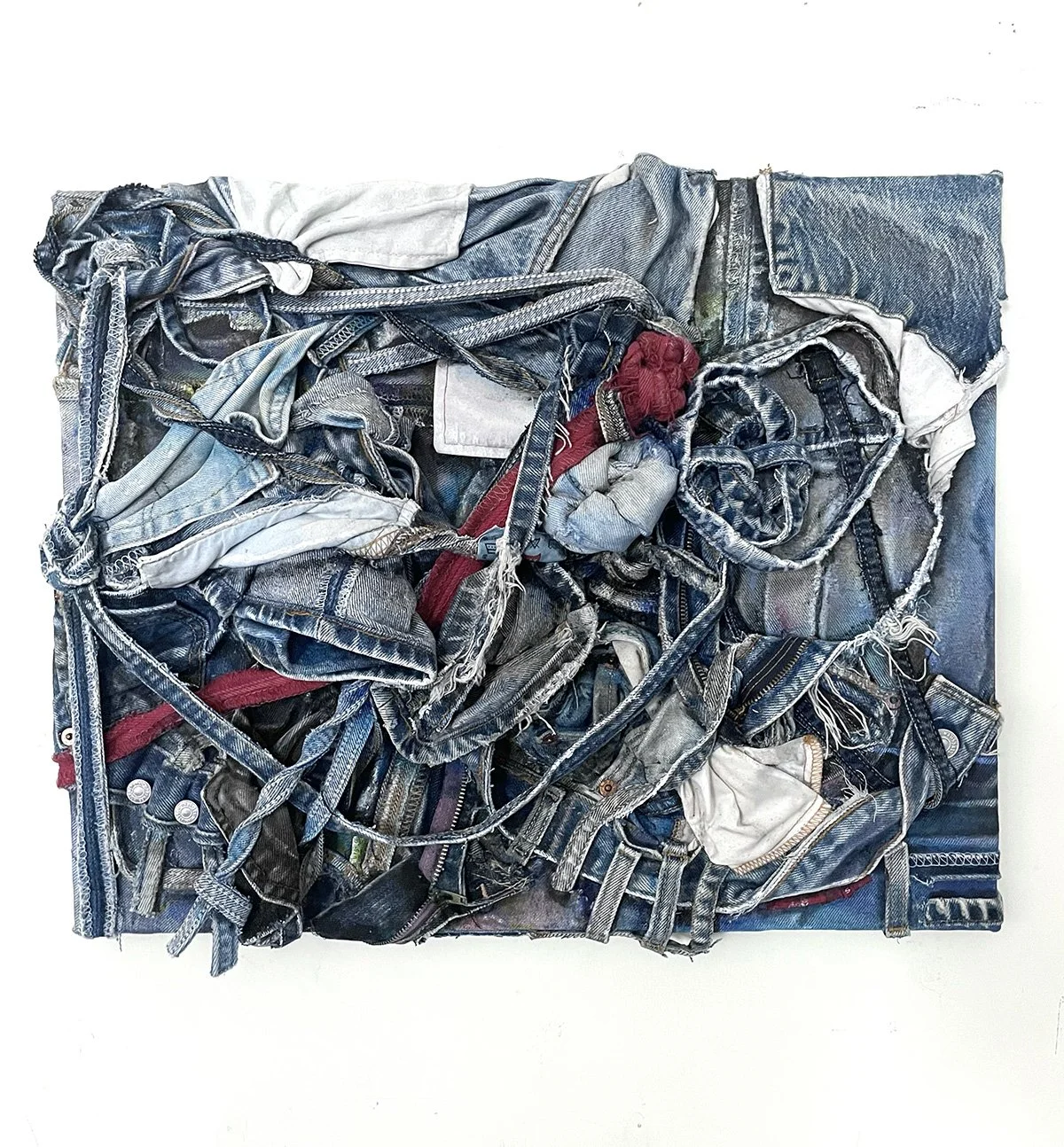 Blue and red Levi's denim scraps mounted on panel