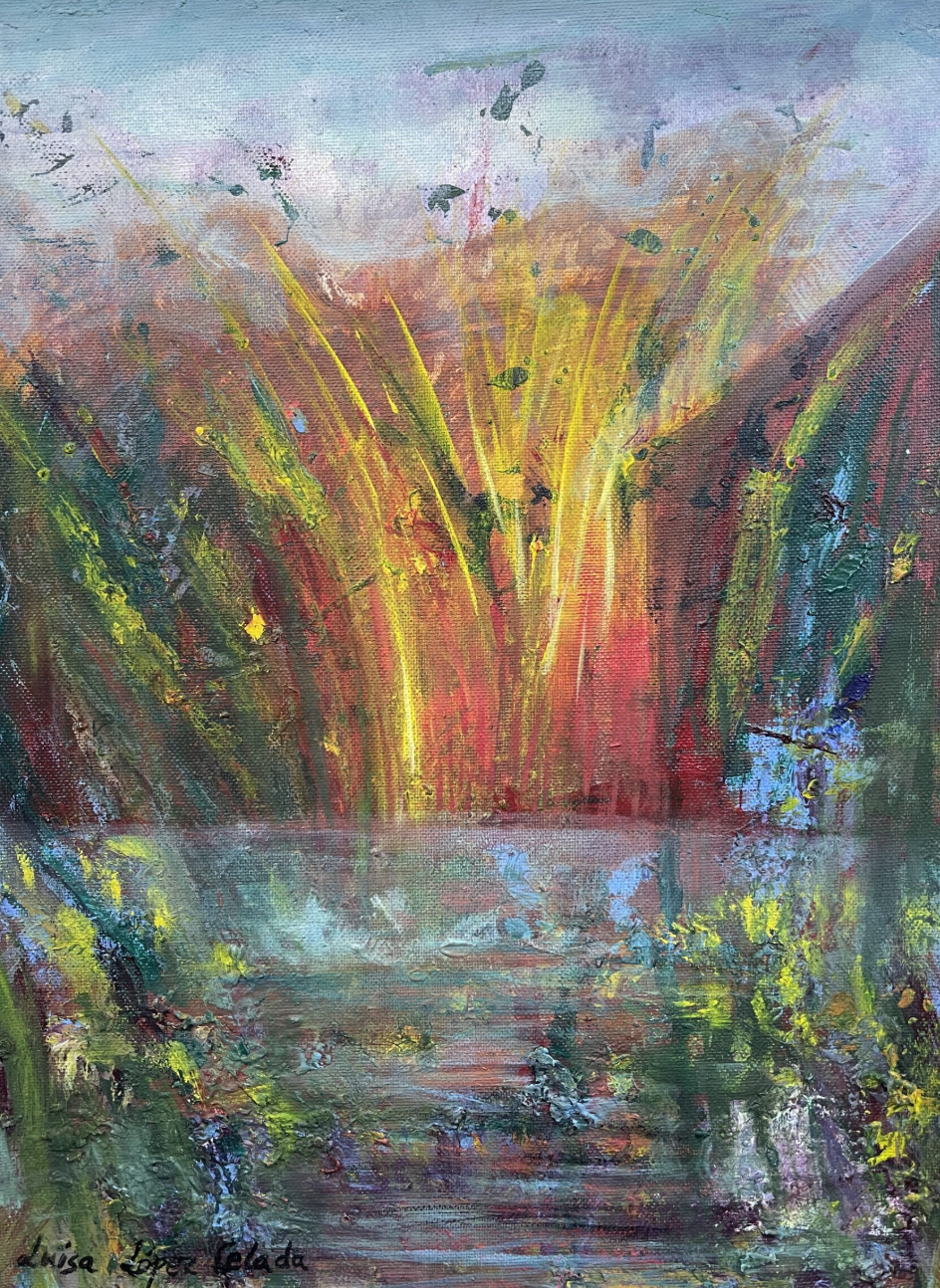 You can use rhythm, tempo, and the texture of instruments and vocals to guide your brushstrokes and color palette. Think of painting as a form of movement, like Life Explosion by Luisa Lopez Celada.