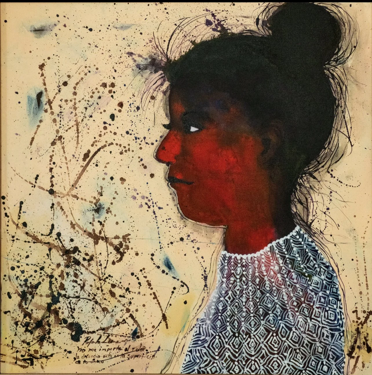 My art addresses social tensions, emphasizing racial and gender differences. My work depicts images of female figures. Likewise, the composition alludes to the stress caused by the opposition between conventionalism and the forced masks imposed by traditional stereotypes.